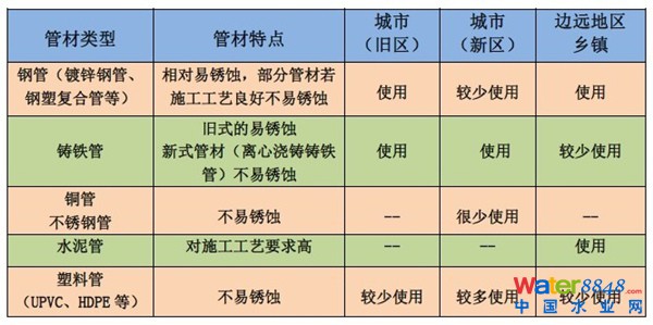 從全國(guó)范圍來(lái)看, 管材是各種各樣五花八門(mén)。從相對(duì)易銹蝕的鋼管(鍍鋅鋼管, 鋼塑復(fù)合管等)、舊式鑄鐵管,到不易銹蝕的銅管、不銹鋼管乃至塑料管,在城市舊區(qū)、新區(qū),以及鄉(xiāng)鎮(zhèn)地區(qū)都有不同的使用情況。
