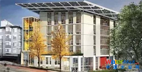 在西雅圖布利特中心的太陽能電池板下,屋頂收集的雨水通過濾池的過濾后可以生產(chǎn)出飲用水。同時,洗滌和沐浴的灰水收集后通過人造濕地過濾,然后進入土壤,回歸自然。這個建筑最為知名之處可能是其廁所用水非常少,每次使用只消耗兩湯匙的水。