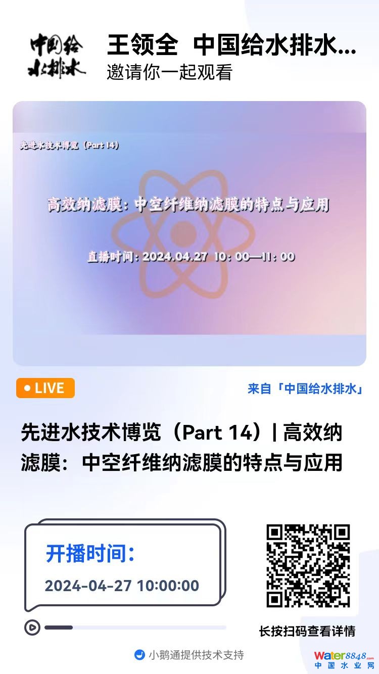 高效納濾膜:中空纖維納濾膜的特點與應(yīng)用 直播時間:2024年4月27日(周六)10:00-11:00 2024-04-27 10:00:00 開始-先進水技術(shù)博覽(Part 14)