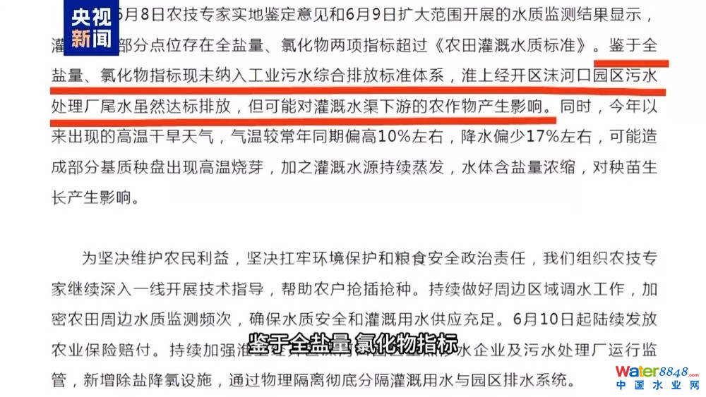 通報(bào)稱(chēng):鑒于全鹽量、氯化物指標(biāo)現(xiàn)未納入工業(yè)污水綜合排放標(biāo)準(zhǔn)體系,淮上經(jīng)開(kāi)區(qū)沫河口園區(qū)污水處理廠尾水雖然達(dá)標(biāo)排放,但可能對(duì)灌溉水渠下游的農(nóng)作物產(chǎn)生影響。