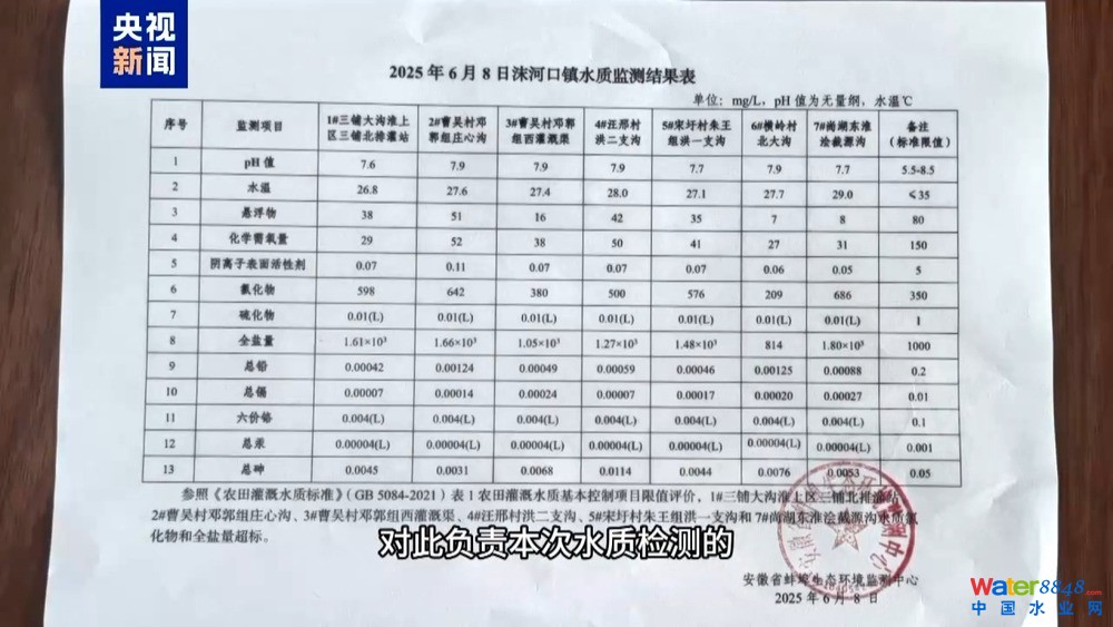根據(jù)6月10日蚌埠市及淮上區(qū)聯(lián)合工作組的情況通報(bào),三鋪大溝的灌溉區(qū)域部分點(diǎn)位存在全鹽量、氯化物兩項(xiàng)指標(biāo)超過(guò)《農(nóng)業(yè)灌溉水質(zhì)標(biāo)準(zhǔn)》。