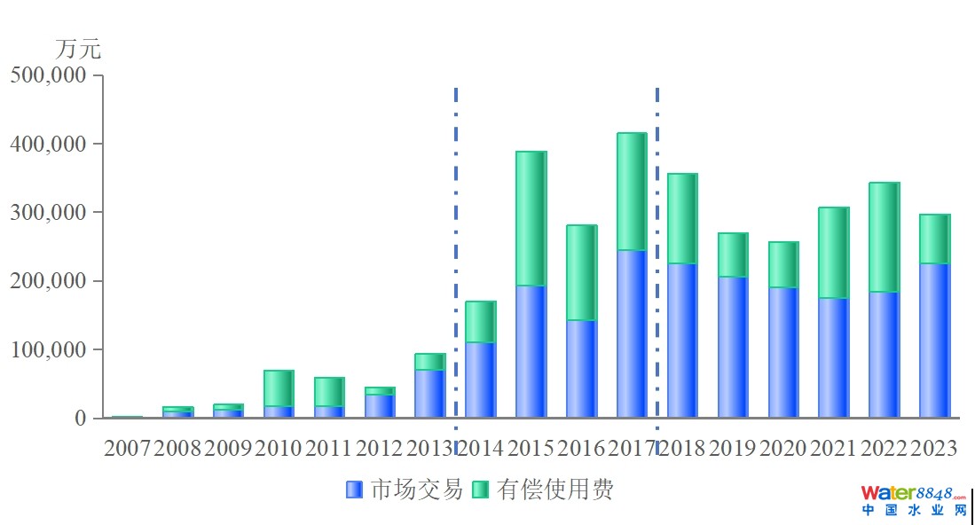 2007-2023年全國排污權(quán)有償使用與交易金額