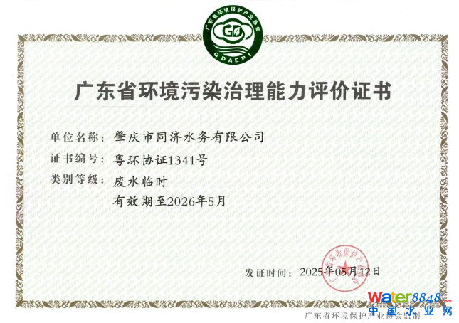 同濟環(huán)境·肇慶市同濟水務(wù)有限公司榮獲2025年第一批廣東省環(huán)境污染治理能力評價證書